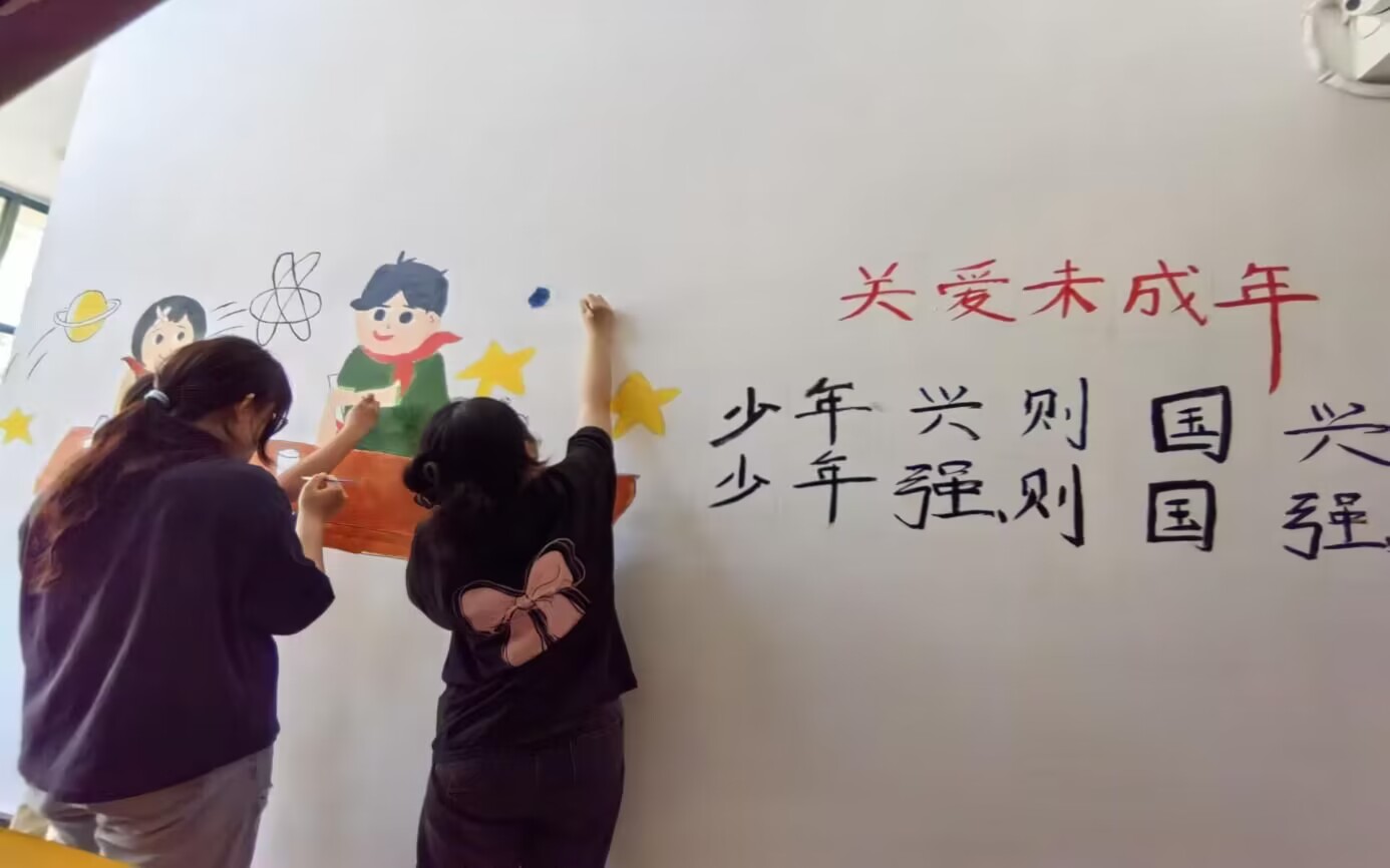 第三幅墻繪以“關(guān)愛未成年人”為核心主題,由朱宏超、謝靜、楊婧瑜三名隊員共同協(xié)作精心繪制而成。這是一幅傳遞關(guān)愛未成年人理念的宣傳教育畫作。在墻繪的左側(cè),兩位孩子正坐在桌邊,其中一位孩子正熱情地發(fā)表著自己的觀點。而墻繪的右側(cè)醒目地書寫著“關(guān)愛未成年人”以及“少年興則國興,少年強則國強”的標(biāo)語。這幅作品深刻強調(diào)了青少年在推動國家發(fā)展進程中的關(guān)鍵角色,寓意著國家的繁榮與昌盛依賴于青少年的活力與積極進取,國家的強大與振興依賴于青少年的全面素質(zhì)與能力提升。