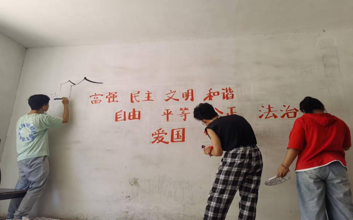 第一幅墻繪以社會主義核心價值觀為靈魂主題,由高子杰、陸玥、鄒嘉俊三位隊員攜手共創(chuàng)。墻繪將房屋、樹木、飛鳥等自然元素融為一體,其中房屋代表著溫馨的家庭與和諧的社區(qū)氛圍,樹木寓含著生命的蓬勃發(fā)展與繁榮,飛鳥則寓意著對自由的渴望與心靈的平和。墻繪之上的文字,正是社會主義核心價值觀,它旨在提升居民的法律意識,明確劃分行為的邊界,為構(gòu)建法治社區(qū)和保障居民合法權(quán)益奠定了穩(wěn)固的基礎(chǔ)。同時,社會主義核心價值觀深植于中華優(yōu)秀傳統(tǒng)文化的深厚土壤,承載著愛國、敬業(yè)、誠信、友善等中華民族代代相傳的美德,期望通過這幅作品喚起居民對文化的自信與自豪,為文化的傳承與創(chuàng)新注入持續(xù)不斷的活力。