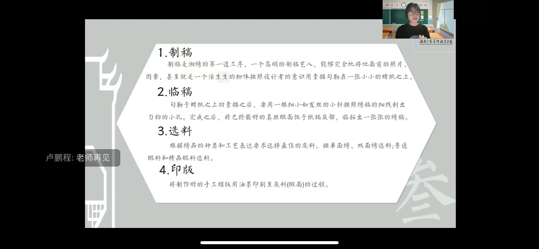 湘繡,作為中國四大名繡中的一朵瑰麗奇葩,擁有千年的歷史積淀和深厚的文化根基。實踐團成員通過線上平臺,借助精心制作的多媒體資料和實物展示,向參與者生動地講述了湘繡從古至今的發展歷程,以及其如何在現代社會中煥發新生。觀眾們沉浸在湘繡細膩的針法和豐富色彩之中,深切感受到了這種古老技藝的生命力與時代價值。