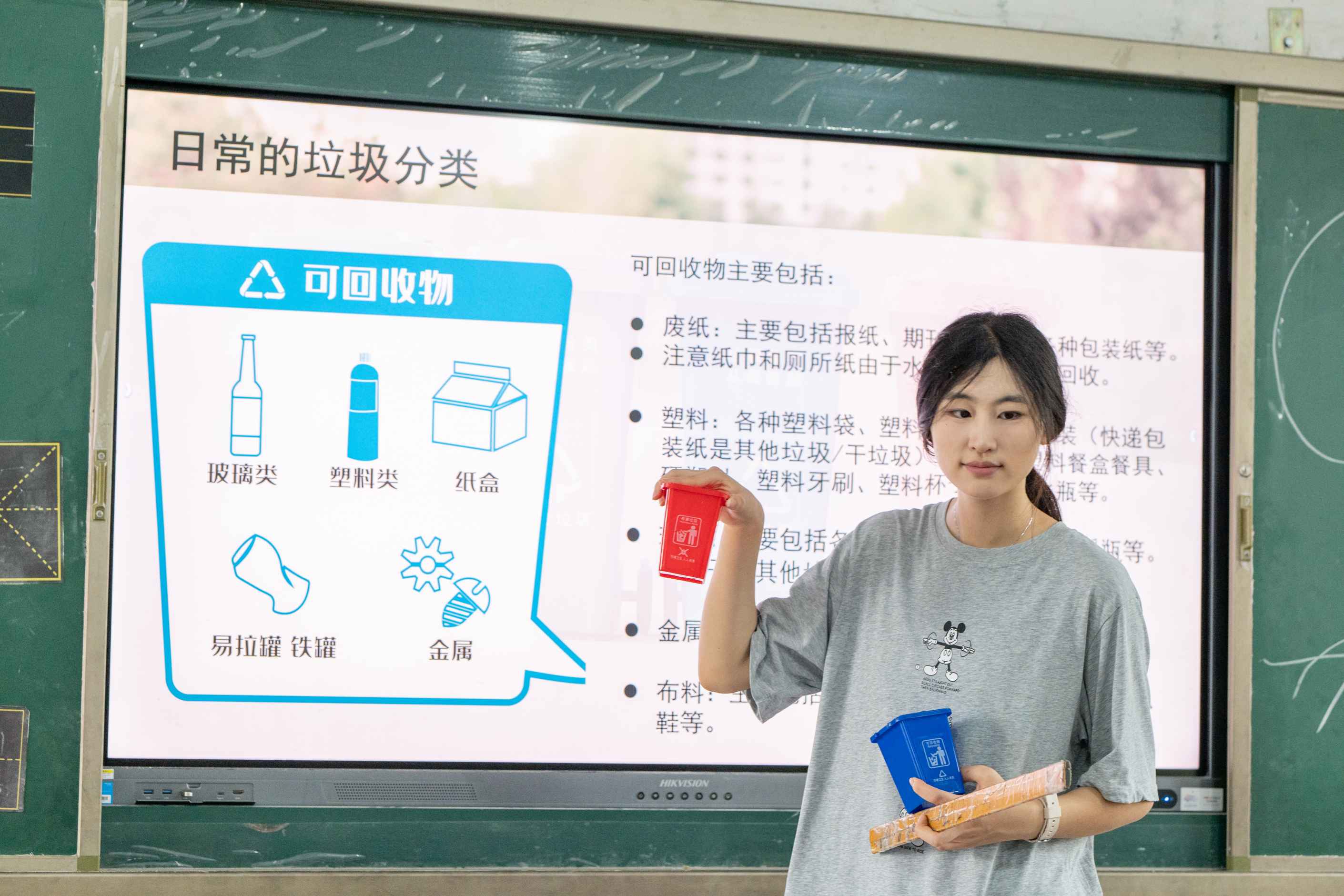 通過互動式的小組討論和實地示范,支教團成員鄧佳妮向學生們詳細解釋了可回收垃圾、廚余垃圾、有害垃圾和其他垃圾的分類標準,幫助他們輕松掌握分類技巧。