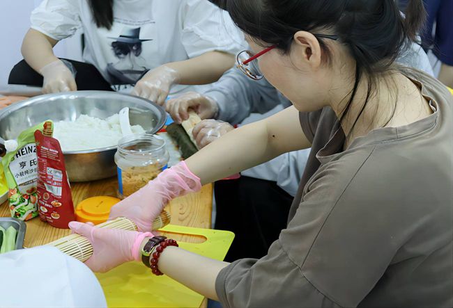 圖為美食節活動中實踐隊成員與老師一起制作壽司的場景。 張振海 供圖