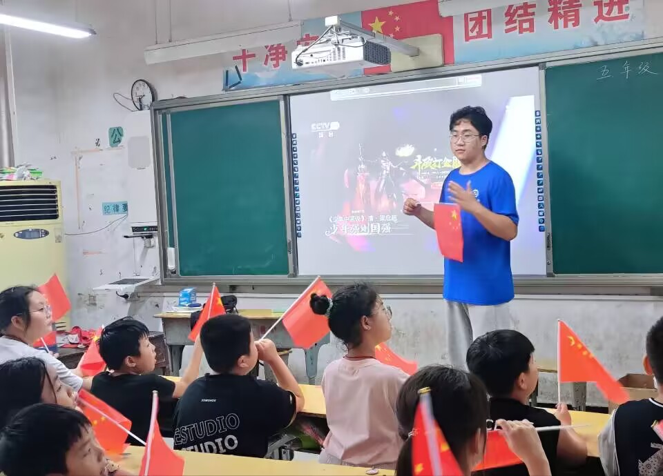服務隊成員帶領學生們歌唱張杰的“少年強則國強”