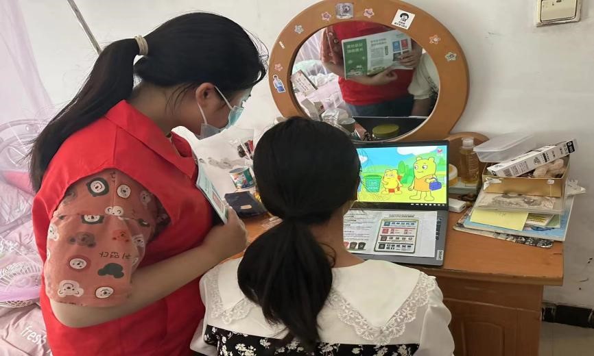 圖為實踐隊員郭心潔正在向連云港市灌南縣居民普及垃圾分類相關知識。