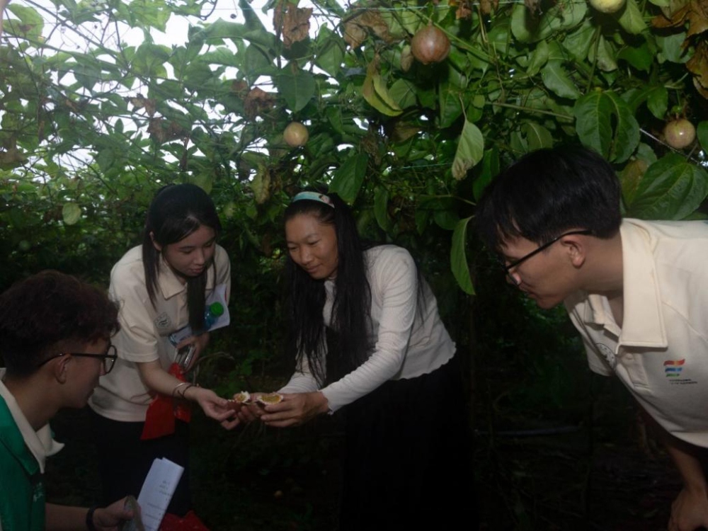 圖為基地負(fù)責(zé)人向團(tuán)隊(duì)成員們展示成熟百香果
