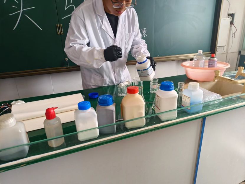 “ 興趣是每個人最好的老師”,化學實驗課上,初三的孩子們迫不及待地想要進行化學實驗,每個人都聚精會神的看著實驗老師的操作,豎起耳朵仔細聽著實驗操作的重點、難點,還有各種實驗室安全注意事項。實驗老師通過自己的化學專業課優勢,將書本知識和實驗課堂融會貫通,簡單有趣的趣味化學實驗,在此刻讓書本知識不再是枯燥的文字,轉而變成一件具有趣味的事情。利用短暫的實驗課堂,幫助他們消化、理解書本課堂上的知識。化學實驗讓他們切實感受到化學的奇妙之旅。“化學是一門以實驗為基礎的科學”,實踐團利用實驗第二課堂培養他們對化學的興趣和動手能力。