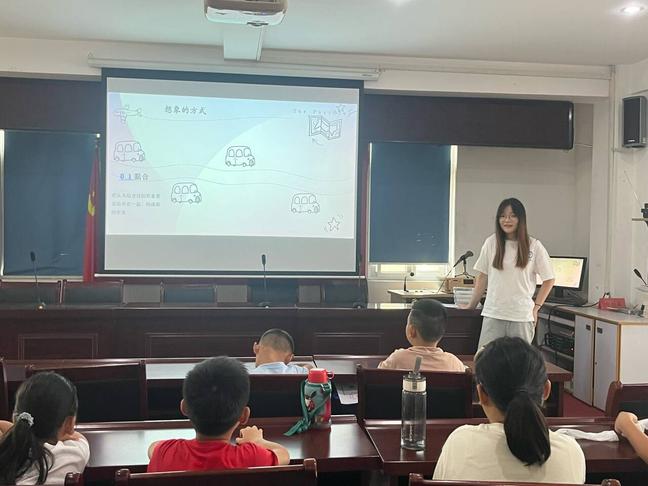 課堂伊始,志愿者老師用生動有趣的教學方式,從“黏合、夸張、人格化、典型化“四個方面向孩子們介紹了各種想象的方式,讓孩子們在輕松愉快的氛圍中感受著想象的魅力。接著,志愿者老師以飽滿的熱情向小朋友們詳細講解了繪畫課程的核心內容,并細心分發繪畫材料。