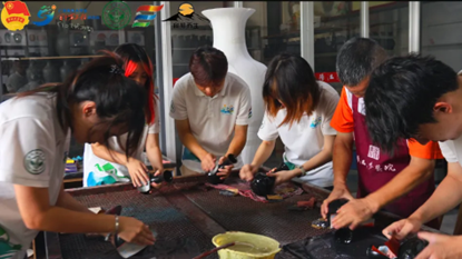 體漆器制作,曉工匠精神。在黎汝漢先生的悉心指導下,實踐隊員們參與到陽江漆器制作的過程中。由于陽江漆具有強粘稠性和速干性,隊員們在上漆時需要全神貫注,確保漆料均勻平整地涂抹在模具表面。在制作過程中,隊員們會遇見涂抹不平的狀況,需要將其打磨光滑,這道工序十分考驗他們的耐心和細致。在探索漆器藝術的過程中,隊員們深刻體會到只有通過堅持不懈的精益求精、精雕細琢的工匠精神,才能打造出精美絕倫的漆器作品。隊員們意識到,每一個細節的處理都是創作過程中不可或缺的一部分,而這種細膩的關注和努力不僅僅是對技藝的追求,更是對傳統工藝的尊重和繼承。