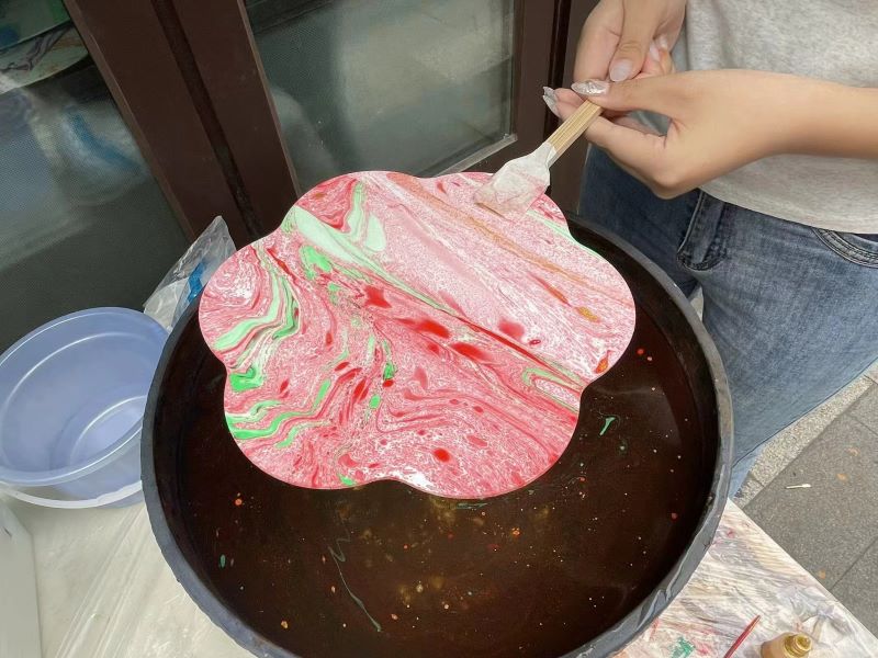而如今體驗的漆扇為“漂流漆“,更為精簡且易上手,利用了漆不溶于水的特質以點、甩、彈、劃等手法在水面繪出圖案效果,每一筆都流淌著東方文化的韻味,將色彩與圖案完美融合,展現出漆扇的獨特魅力。制作漆扇時的水流方向、搖晃方式和速度不同,導致每一把漆扇都是獨一無二的,出水便是獨家定制的“孤品”。