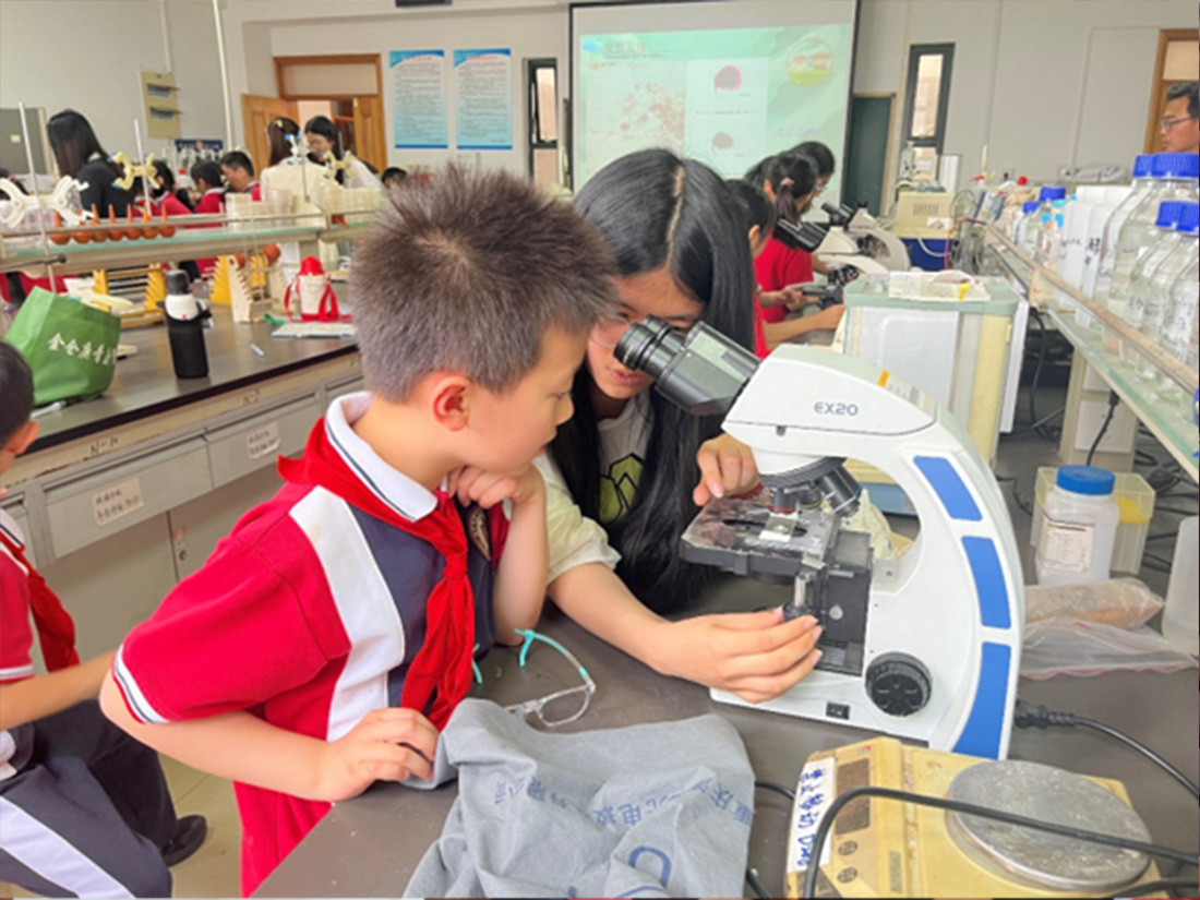 圖為實踐隊隊員在帶領小朋友通過顯微鏡觀察污水中的微生物