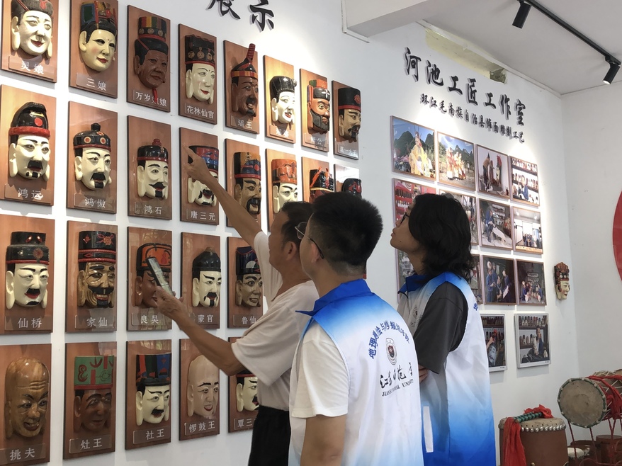 追尋儺面,感受匠心。毛南族儺面具作為毛南族文化的代表,是毛南族文化瑰寶。團隊成員拜訪了毛南族第八代儺面具制作人譚建新老師,參觀了譚老師的非遺工作室,學習了儺面具制作流程與牛皮鼓的使用方法。團隊成員與譚建新老師進行深入交流,譚老師強調“儺面具的傳承要注重推陳出新,不同的制作人應將儺面表現出不同的神韻”。與譚老師的交流使團隊成員深刻了解了儺面具在毛南族人民心中的文化內涵,也讓團隊成員進一步堅定了保護少數民族優秀傳統文化的決心。