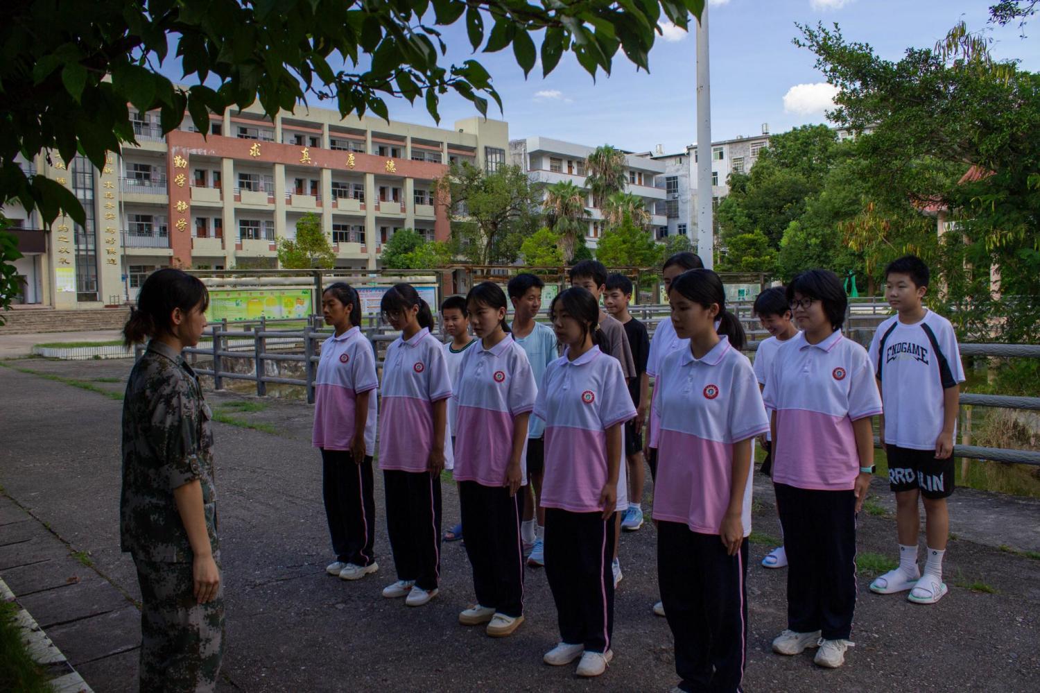 站軍姿、齊步走、正步走……各項動作訓練有條不紊,循序漸進。教練員不厭其煩的講解動作要領并做示范。在教練員的耐心指導下姿勢動作越來越標準,從抬手角度到跨步步幅,畬族小伙伴們姿勢標準,整齊劃一。烈日下,汗水浸濕了衣衫,學生的眼神卻愈發堅毅,彰顯出頂天立地的青年力量。