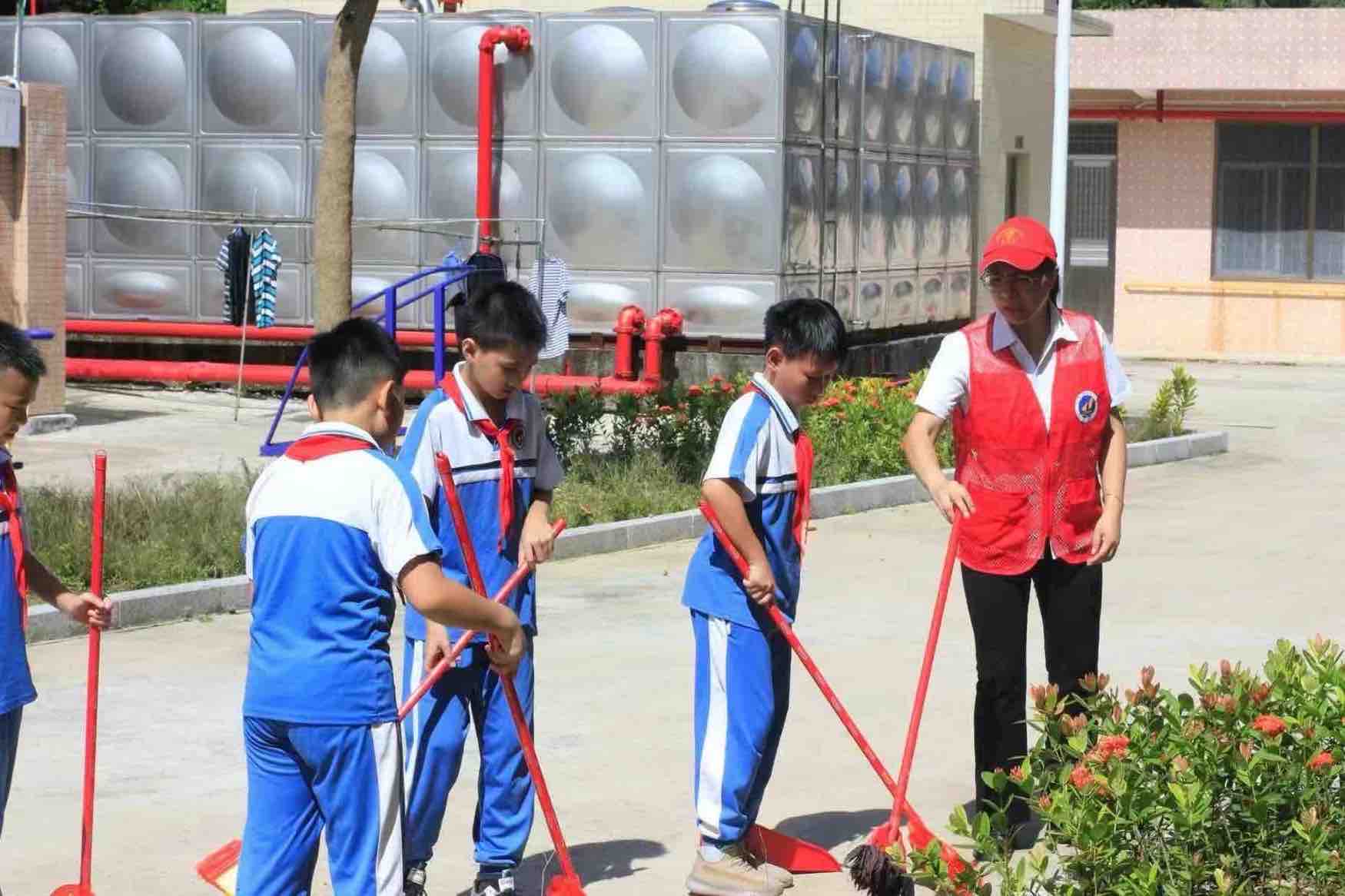 (圖為志愿者和沙扒鎮中心小學的同學們一起打掃敬老院衛生 實踐隊隊員 陳麗梅 攝)