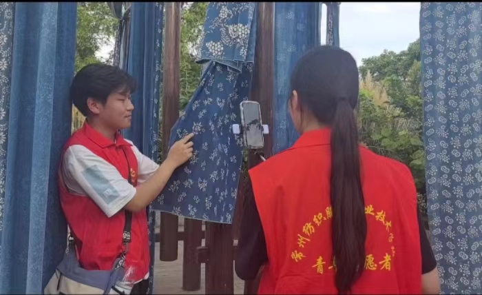 在這里,團(tuán)隊(duì)借助現(xiàn)代科技手段,開展了一場(chǎng)別開生面的線上講解直播活動(dòng)。直播中,鏡頭緩緩掠過并以實(shí)踐團(tuán)成員直播為主介紹子愷畫校、子愷餐廳、振華書院、子愷漫屋、云上錦拼布館、千葉茶吧等多種業(yè)態(tài),同時(shí)著重介紹了子愷染坊印染工藝等等,也為后續(xù)前往非同裕染坊打下基礎(chǔ)。子愷漫畫村是依托江南傳統(tǒng)村落的特色風(fēng)貌,打造了一個(gè)集漫畫文創(chuàng)和研學(xué)為主題的生態(tài)型鄉(xiāng)村將漫畫元素融入到村莊建設(shè)的方方面面,形成獨(dú)特的文化氛圍。