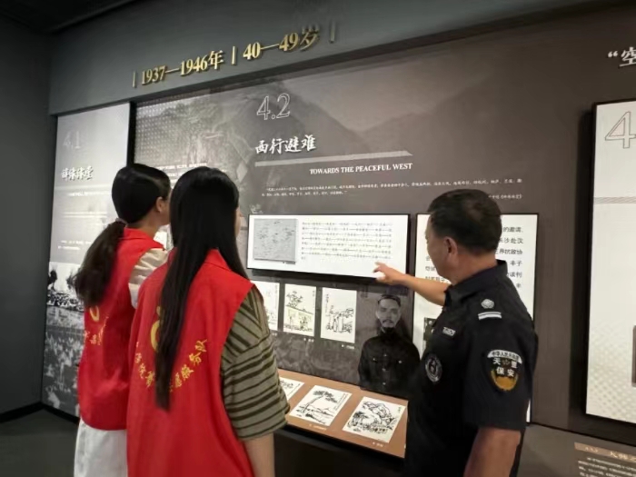 紀(jì)念館內(nèi)其二就是豐子愷漫畫館,實(shí)踐團(tuán)仔細(xì)觀賞了豐子愷先生的漫畫作品、文學(xué)作品以及各類珍貴文物。通過工作人員的生動(dòng)介紹,他們不僅了解了豐子愷先生的生平事跡和藝術(shù)成就,還深刻感受到了他對(duì)家鄉(xiāng)桐鄉(xiāng)的深厚情感與貢獻(xiàn)。豐子愷非常愛孩子,他的漫畫和散文中常常出現(xiàn)孩子的身影。他對(duì)待孩子純?nèi)灰黄瑴厝峥嘈,在院子里安置滑梯、沙坑等兒童游樂設(shè)施。在求學(xué)之路上豐子愷進(jìn)入杭州的師范學(xué)校,期間遇到了對(duì)他影響深遠(yuǎn)的恩師如夏丏尊和李叔同。李叔同曾贊揚(yáng)他的圖畫進(jìn)步快速,并鼓勵(lì)他以此為業(yè),豐子愷的漫畫創(chuàng)作始于偶然間的嘗試,并逐漸形成了自己獨(dú)特的藝術(shù)風(fēng)格,他的簡(jiǎn)筆畫首次公開發(fā)表后引起了廣泛關(guān)注,并被冠以“漫畫”之名。以此他在《舊話》中提到:“我的入師范學(xué)校是偶然的,我的學(xué)畫也是偶然的,我的達(dá)到現(xiàn)在的生涯也是偶然的。”無數(shù)的偶然促成了現(xiàn)在的豐子愷,抗日戰(zhàn)爭(zhēng)期間,他雖然疲于奔命,但仍堅(jiān)持用畫筆勾勒戰(zhàn)時(shí)百態(tài)。他的畫作中既有憤懣諷刺之作也有悲憫激勵(lì)之作展現(xiàn)了深厚的愛國情懷。豐子愷的一生充滿了藝術(shù)追求和人文關(guān)懷,同時(shí)與桐鄉(xiāng)緊密相連,他的藝術(shù)作品中充滿了對(duì)家鄉(xiāng)風(fēng)土人情的描繪與贊美,為桐鄉(xiāng)的文化發(fā)展留下了寶貴的財(cái)富。