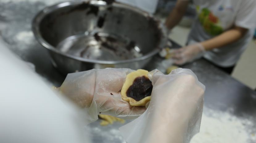 聽完楊師傅的介紹,隊員與學生們跟隨楊師傅的步伐,穿上了圍裙、戴上口罩,專注學習月餅的每一步制作技巧,全身心的投入與感受這份技巧之下的非遺古韻。