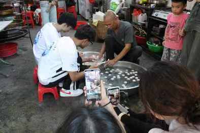 (“豐之驕”隊員與老板劉漢釵直播制作魚丸)