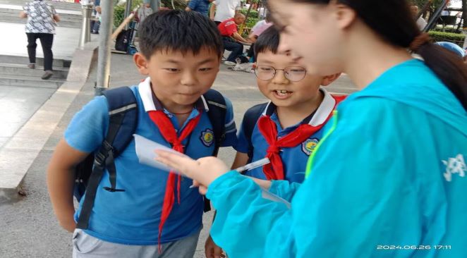 2024年6月26日,炎炬似火的夏日午后,源園公園內(nèi)熱鬧非凡。一支身穿統(tǒng)一服裝的年輕隊(duì)伍正在公園的一角忙碌著,他們就是"醫(yī)護(hù)相伴,青春不'毒'行"暑期實(shí)踐隊(duì)。