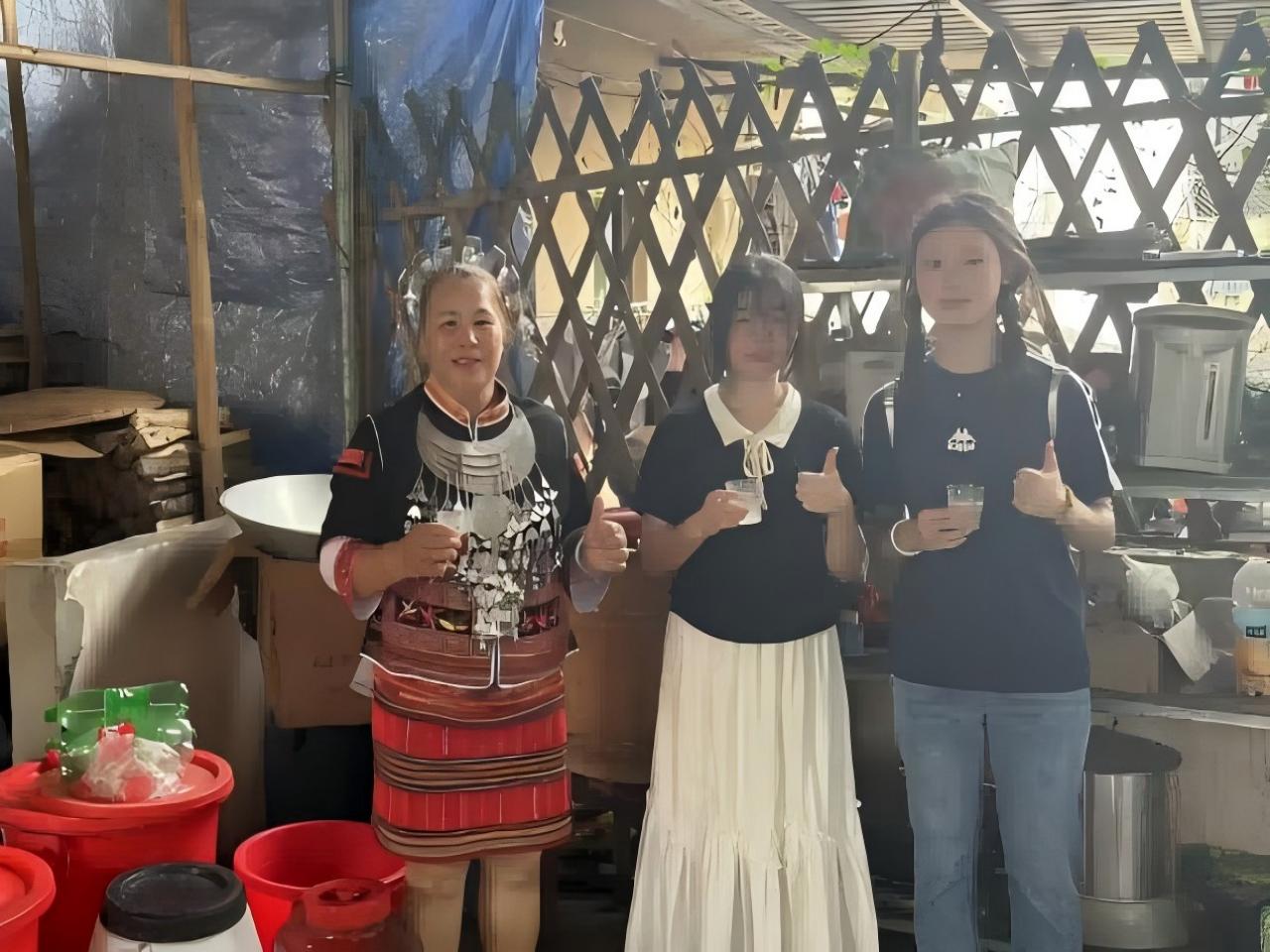 第三站實踐團隊赴紅毛鎮坎茂村,向并酒釀造技藝傳承人學習酒釀知識;赴紅毛鎮草南村,向民歌傳承人學習黎錦文化。