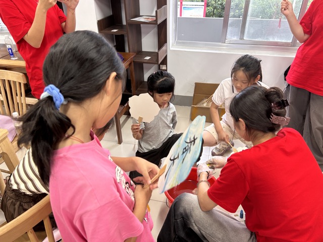 接下來的活動是制作漆扇,這對孩子們來說無疑是一次期待已久的創(chuàng)作體驗(yàn)。志愿者們精心準(zhǔn)備了各種形狀和大小的漆扇,讓孩子們可以根據(jù)自己的喜好進(jìn)行選擇。每一面扇子都是一塊空白的畫布,等待孩子們用心去書寫詩句、寄語,或者畫上他們心中的小作品。在活動現(xiàn)場,志愿者幫助小朋友們完成扇面的書寫,有些孩子選擇用優(yōu)美的詩句來裝點(diǎn)扇面,比如“春和景明”、“平安喜樂”,每一個(gè)扇面都承載著孩子們童真的情感和深深的愿望,這樣的創(chuàng)作體驗(yàn)不僅僅是技藝的學(xué)習(xí),更是心靈的交流和表達(dá)。通過書寫和繪畫,孩子們學(xué)會了用藝術(shù)去表達(dá)自己的感受和想法,培養(yǎng)了他們的創(chuàng)造力和想象力。志愿者們在一旁耐心指導(dǎo),鼓勵(lì)每一位孩子充分發(fā)揮想象力,勇敢地將內(nèi)心的世界展現(xiàn)出來。活動不僅僅是一次藝術(shù)創(chuàng)作的機(jī)會,更是孩子們與傳統(tǒng)文化相結(jié)合的契機(jī),讓他們在快樂中感受到中華傳統(tǒng)藝術(shù)的魅力和深遠(yuǎn)影響。