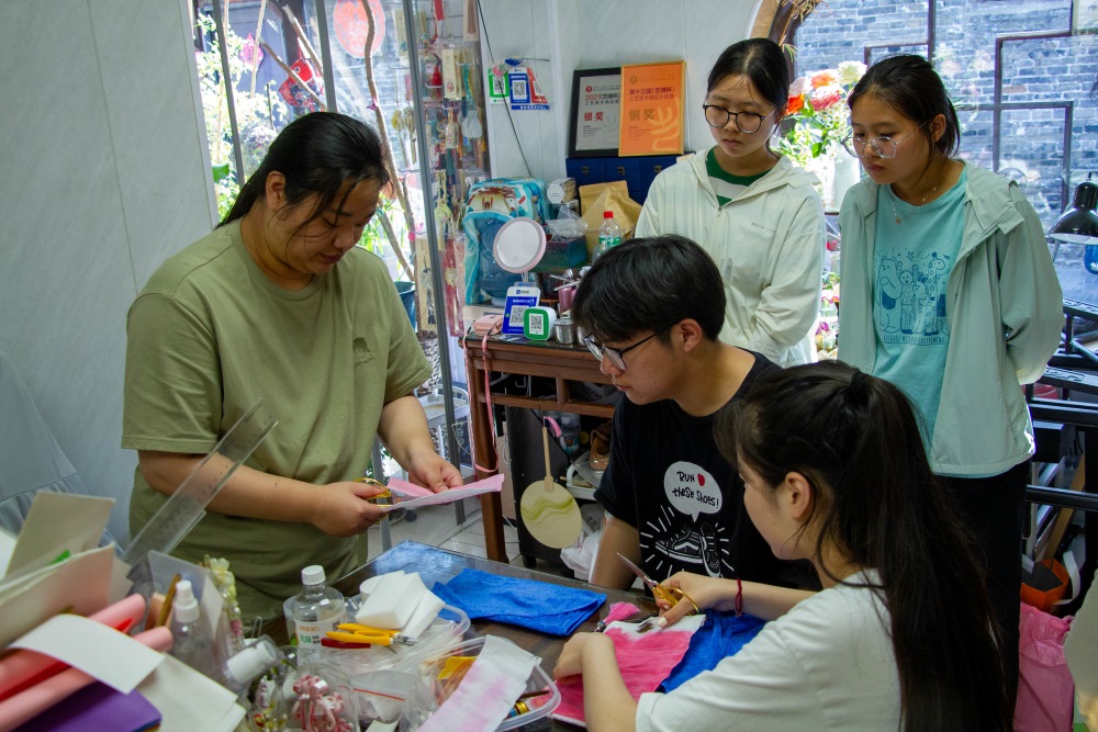 工作室里展示了多樣化的通草花作品,從春意盎然的四季花卉到寓意吉祥的傳統(tǒng)圖案,再到融入現(xiàn)代藝術(shù)元素的創(chuàng)新之作,各式各樣的通草花成品瞬間吸引力實(shí)踐團(tuán)成員們的興趣。非遺傳承人崔芳凝老師介紹到,揚(yáng)州通草花是以通草為原料,經(jīng)漂白、裱草片、染色、捏瓣、做葉子、傳枝干、栽盆、整理等多道工藝流程制作而成的一種特色工藝品。實(shí)踐團(tuán)聽的津津有味,饒有興趣。