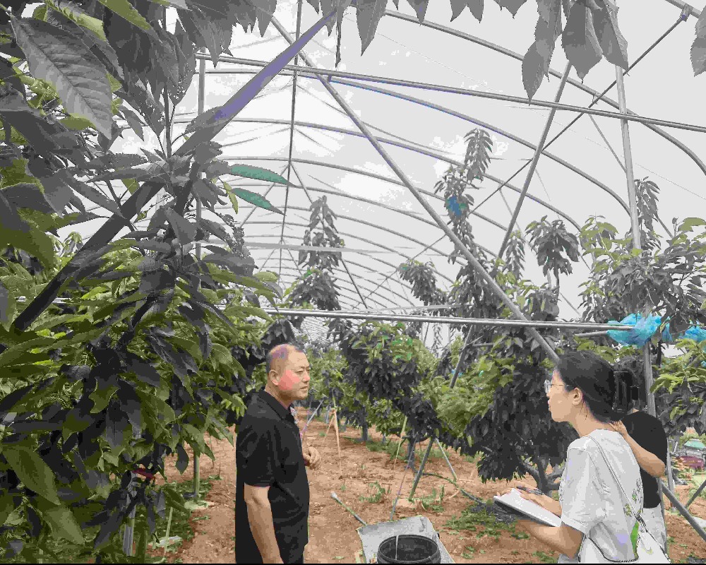 隨后,書記帶領成員來到了當地的櫻桃園進行實地考察,仔細講解了櫻桃園的生產管理過程、殺菌滅蟲的注意事項、銷售模式及生產規模等。孫國民更詳細的為實踐隊介紹并示范使用了村子里各種用以提高產能技術、工具,例如依托當地水庫之多而運用的滴灌技術、防飛鳥的警示儀器等。孫書記滔滔不絕的熱情介紹,不僅讓成員們感嘆果業發展的艱辛不易,也讓成員們深深感受到了書記為鄉村振興,產業發展所做出的努力與貢獻。