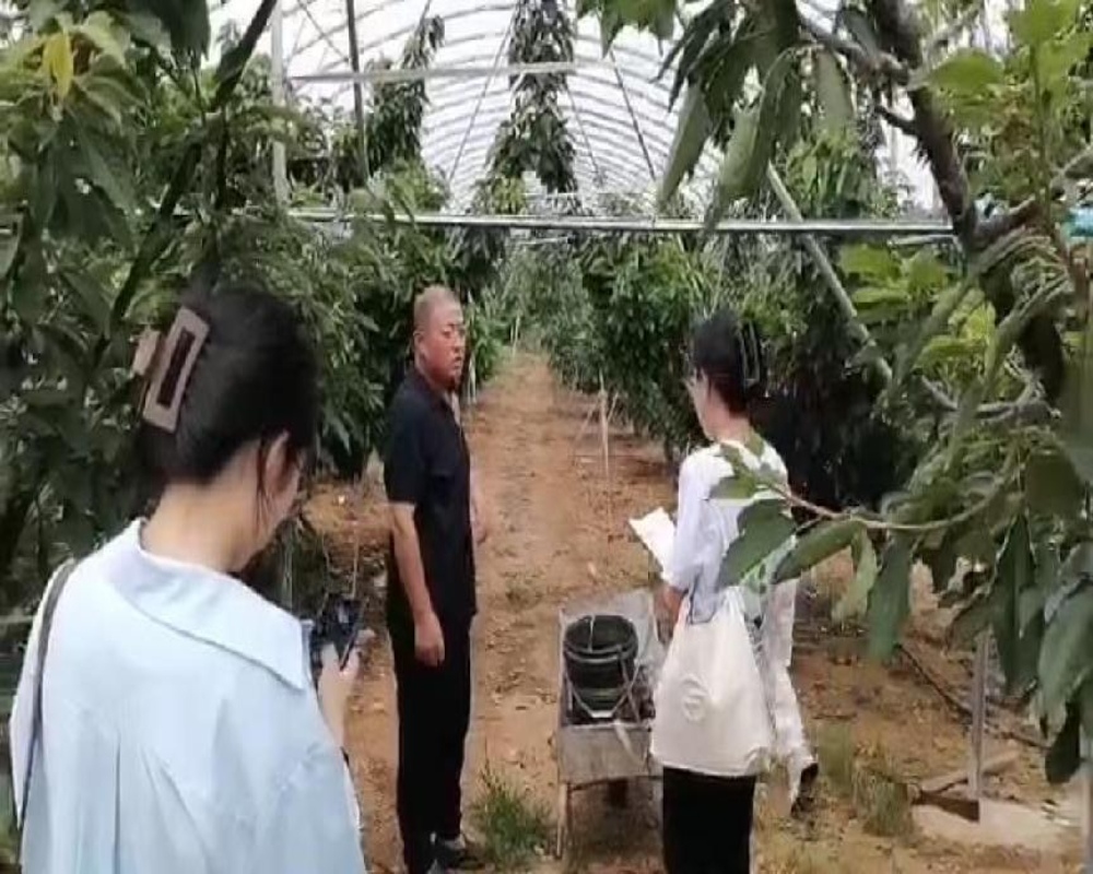 老楊櫻桃采摘園是煙臺市萊山區(qū)祁家屯村的一個特色采摘地。7月7日,實踐團深入采摘園展開調研,經(jīng)老板楊月軍同意后,在工作人員帶領下走遍果園,深入了解灌溉方式、護理方式、病蟲害治理以及各種櫻桃品種的優(yōu)劣,探索新的管理種植方式。