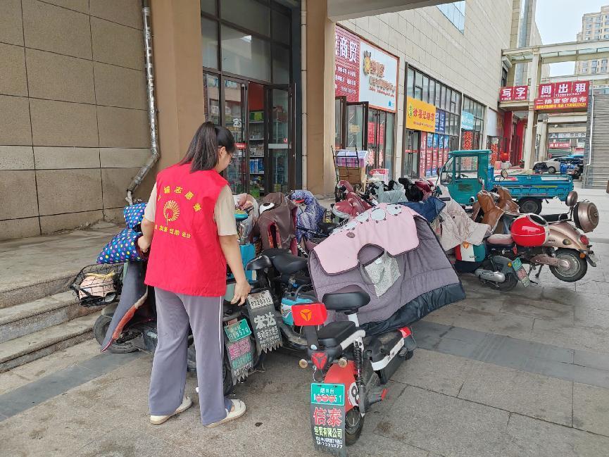圖為實踐隊隊員與環衛工人進行交流。下午2點,在短暫的休息過后,實踐隊隊員對路邊不規范停放的非機動車進行整理。由于缺少法律的約束,非機動車的停放無法和機動車一樣有較為明確的規定和懲罰制度,停放方式僅僅只是依靠道德的約束,而亂停亂放不僅破壞社區風貌,更使部分居民出行不便,隊員們的整理只能進到綿薄之力。隊員們發現,最近社區規劃出非機動車的停放區域,張貼倡議書表明亂停亂放的危害,提倡統一停放,力求讓人們養成規范整齊停放意識。