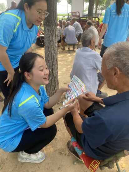 為了讓更多老年人受益,志愿隊還為村民們進(jìn)行健康講座,分發(fā)健康宣傳手冊普及養(yǎng)生知識。同時,他們還為老人們進(jìn)行基礎(chǔ)的健康體檢,為老人們測量血壓、血糖等,表達(dá)了社會對老年人的關(guān)愛。