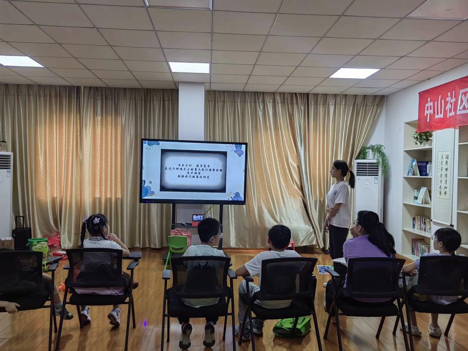 活動伊始,志愿者老師們為孩子們播放了暑托班vlog,孩子們靜靜地坐在位置上,沉浸在精彩的視頻中,當他們看到自己的作品出現在視頻中時,便開始與鄰座的小伙伴們熱切交流起來,他們在交談中提到自己在暑托班收獲頗多,結交到了許多好朋友,并且表示希望明年還能夠參加“青仔公益暑托班”。