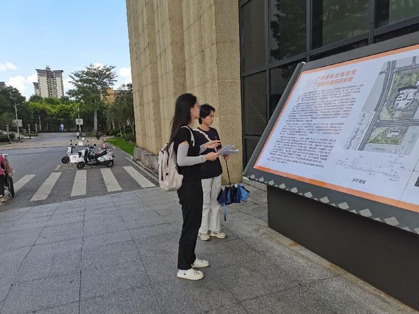 圖為實踐團成員正在參觀蟠龍社區內的廣西體育中心。劉文霞 攝