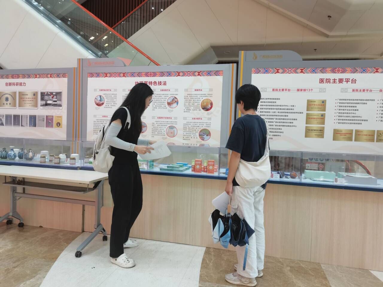 隨后,實踐團來到了蟠龍社區內的壯醫醫院,這里是傳承與發展壯族傳統醫學的重要陣地。在醫院大廳,一幅幅生動介紹壯醫理論的展板吸引了大家的目光,從藥食同源到針灸拔罐,壯醫的獨特療法讓人大開眼界。走進壯醫文化展示柜,琳瑯滿目的草藥標本、古老的診療器具訴說著壯醫悠久的歷史與深厚的文化底蘊。通過與醫生的交流,實踐團成員不僅學習了壯醫的基本理論與治療方法,更深刻體會到民族醫學在保障居民健康、促進民族團結方面的獨特價值。