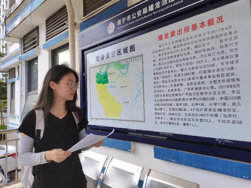 圖為實踐團成員正在參觀蟠龍社區派出所的展示欄,了解社區社會治理的基本情況。劉文霞 攝