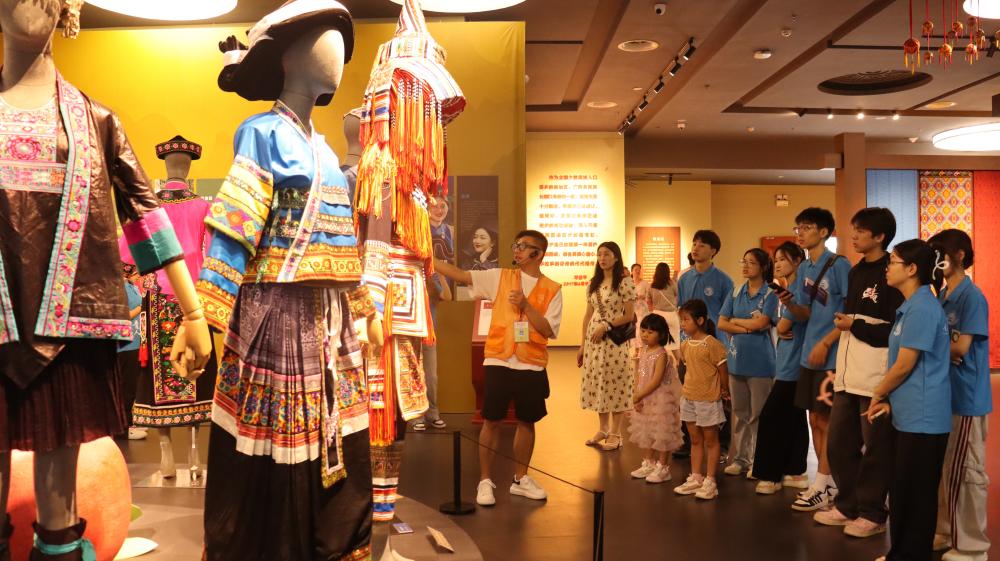 最后,在“五彩八桂—廣西民族文化陳列”展廳,實踐團成員們不僅了解到廣西各民族的基本情況,比如生活方式、住宅建筑、民間工藝、節慶活動、傳統禮儀等等。還看了花山巖壁畫、劉三姐傳說等廣西文化名片的詳細解讀。志愿者著重向實踐團成員們介紹了“霓裳羽衣”展區,廣西12個世居民族獨特的服飾都在這里集中展示。這些展品通過精湛的印染、刺繡和織錦工藝,展現了廣西各民族的傳統美學和手工藝技術,也深刻印證了中華民族文化的豐富性和多樣性。