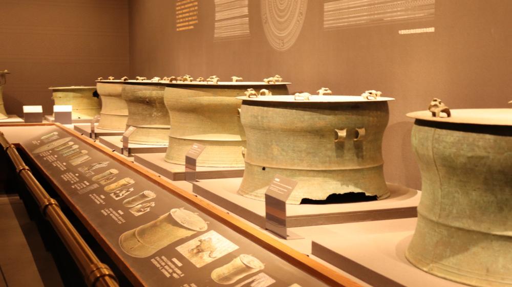 (圖為“穿越時空的鼓聲”展廳陳列的幾面銅鼓)