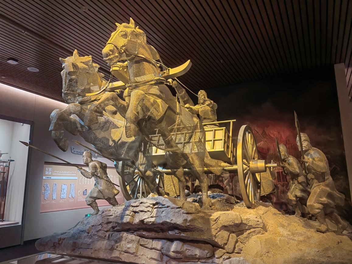 走進博物館,團隊成員首先來到了殷墟車馬遺跡展廳。這個展廳仿佛是一個時光隧道,將人們帶回到了三千多年前的殷商時代。展廳內,一輛輛保存完好的馬車靜靜地陳列著,仿佛在訴說著那個時代的輝煌與榮耀。這輛馬車造型精美,工藝精湛,充分展示了殷商時期高超的造車技術。車輪巨大,輻條整齊,車身裝飾華麗,有的還刻有精美的圖案和銘文。裝飾華麗、結構輕巧、機動靈活的馬車,展現著商王朝卓越的制造技術,是中國目前所見最早的馬車實物標本,更是對三千多年前商文明的生動詮釋。
