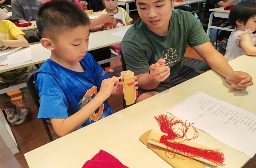 20240702圖為蓮花落瑩小隊成員教小朋友正在嘗試使用快板 “蓮花落瑩”隊隊員胡予博 供圖