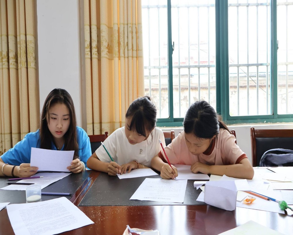 在義教時(shí)間里,本隊(duì)秉承“為孩子們送溫暖”的服務(wù)宗旨和理念,根據(jù)當(dāng)?shù)亓羰貎和瘜W(xué)習(xí)的薄弱環(huán)節(jié)和課程的缺失,有針對(duì)性的開(kāi)展與說(shuō)好普通話相結(jié)合的課程,包括:手工制作講解、國(guó)學(xué)經(jīng)典朗誦、歡樂(lè)游戲互動(dòng)、順口溜比賽、應(yīng)用繪畫描述等。