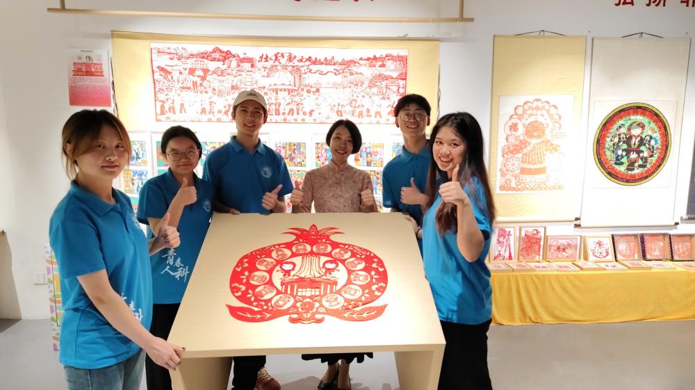 (圖為實(shí)踐團(tuán)成員與鐘老師及其她的剪紙代表作合影)