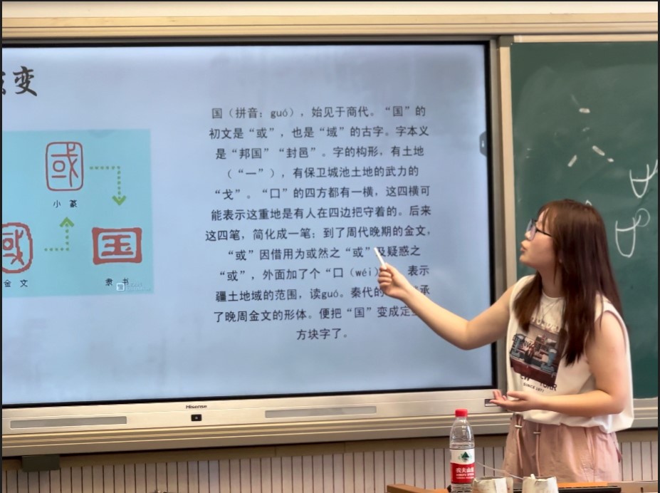 團隊成員張晶晶和郭思敏同學通過播放生動的視頻讓學生們對甲骨文有初步步的印象,再通過具體的介紹讓他們進一步了解,體會中華文化的博大精深。介紹了以風物和交通為主題的甲骨文單字寫法,并強調了“周山”的甲骨文寫法,小朋友們表現出濃厚的興趣。
