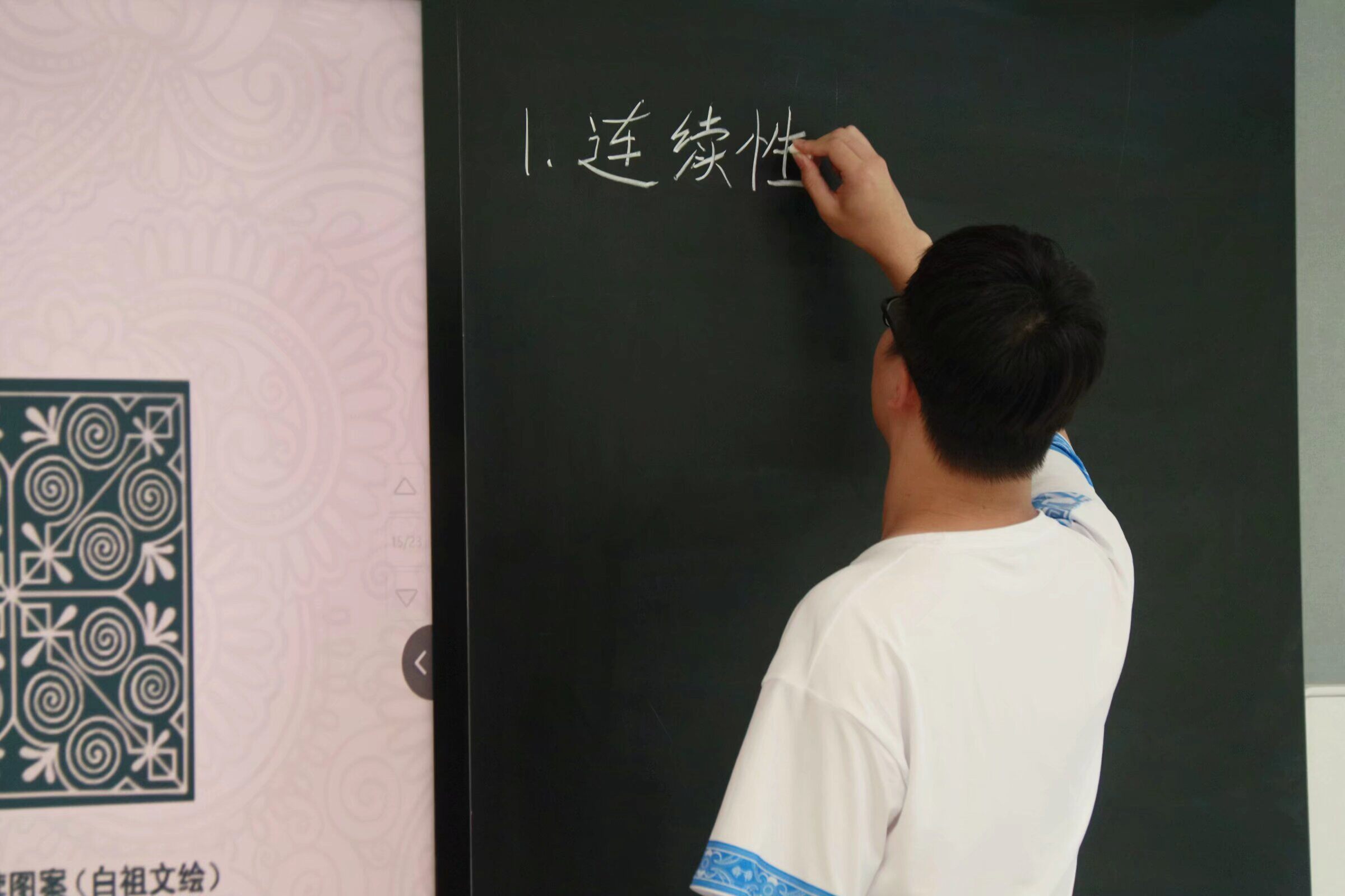 吳陳越首先耐心細致地為同學們講述了各族人民別具特色的民族紋飾的歷史由來、組成特點及其蘊含的精神文化。多樣的幾何紋飾,色調古樸協調又鮮艷明麗,具有濃郁的地方特色,宛如一幅畫、一卷書,代代相傳。
