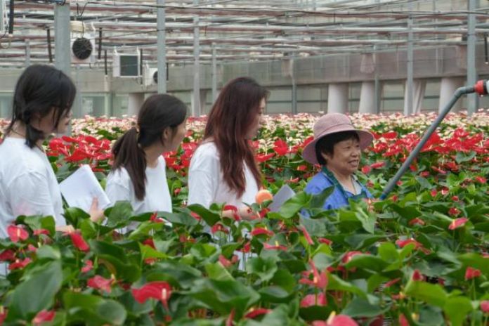 團隊前往園區內花卉生長基地,大片的紅掌展現出強大的生命力,調研小組了解到紅掌這種植物對于溫度比較敏感,適宜生長溫度為14℃-35℃;對于光照條件也有一定要求,需放置在明亮的陰蔽場所。