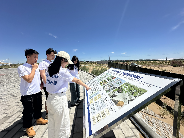 走下觀光塔,實踐團成員漫步于光伏陣列之間,目之所及,不再是黃沙漫天,而是盈盈綠意。負責人向師生介紹:目前板下作物種類已經超過了三十種,主要經濟作物有黃芪、黃芩、甘草,主要牧草有紫穗槐、揚柴、蛋白桑,這些作物的栽種不僅使得民生改善的步伐更加堅實有力,也促進了生態修復。達拉特光伏發電應用領跑基地緊緊抓住國家以沙漠、戈壁、荒漠地區為重點布局建設大型風電光伏基地的重大歷史機遇,創新性地融合了“光伏發電+生態治理+鄉村振興”的發展模式,深入推動了生態文明建設的進程,為踐行“碳達峰,碳中和”國家戰略貢獻綠能碳匯的力量。隨著光伏項目的深入實施,昔日的不毛之地植被覆蓋率顯著提升,生物多樣性逐漸恢復,真正實現了經濟效益與生態效益的“共贏”。這片曾經的“死亡之海”,如今正煥發出勃勃生機,向世界展示著人與自然和諧共生的美好愿景。