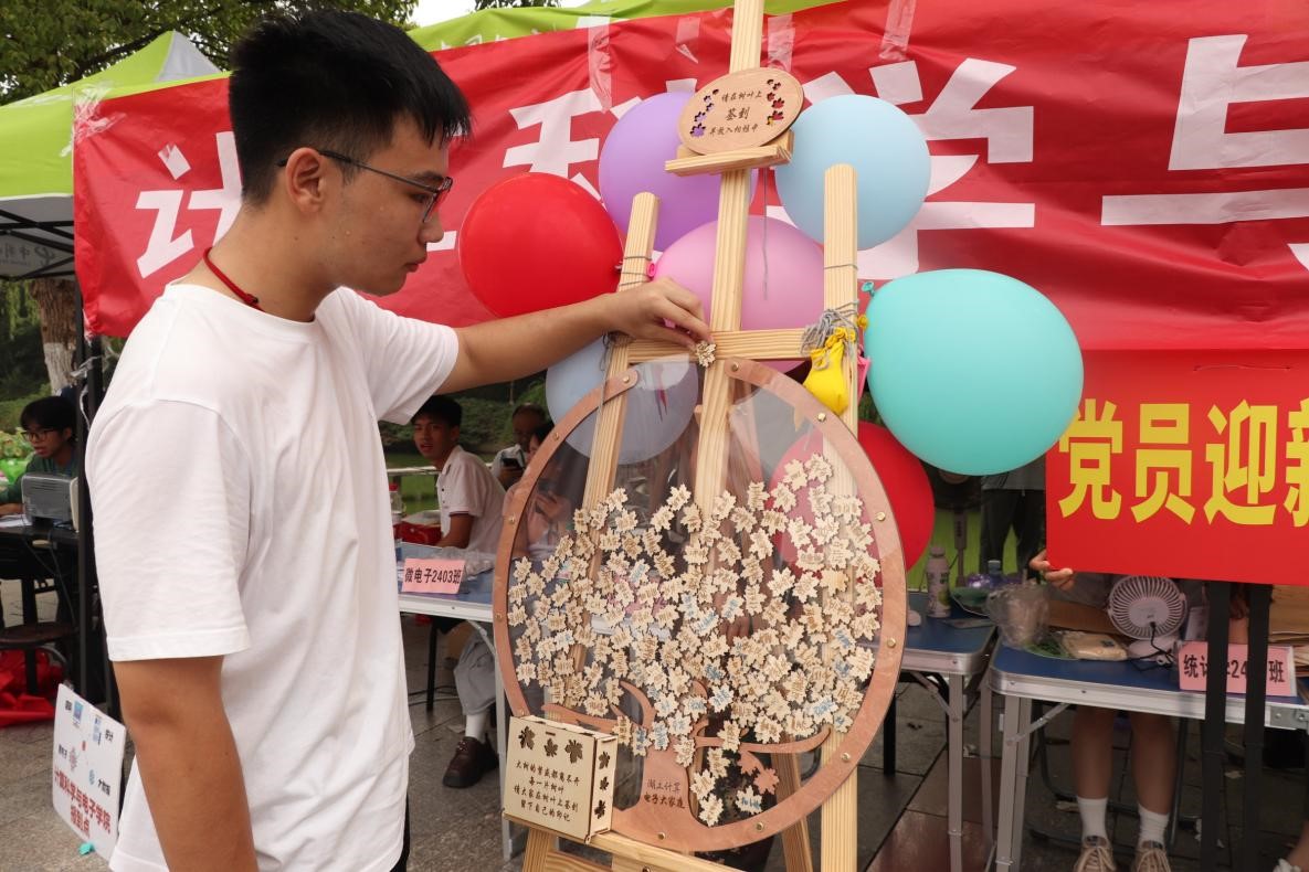 紅色第一課:傳承紅色基因 賡續紅色血脈“今年是新中國成立多少周年呢?”“中國共產黨是何時誕生的?”學院在迎新點上設立了“我講‘新’聲給黨聽”展示板、“流動紅色故事館”、黨史知識有獎問答,“青馬青語”宣講團的志愿者們在迎新現場一一為新生們講述紅色故事,有黨史故事、新中國史故事、改革開放史故事...“初到湖工校園,就感受到了學校濃濃的紅色基因。在未來的四年學習生活中,我要努力學習科學文化知識,報效祖國,腳踏實地為青春積蓄青春力量。”24級第一個報到新生信息與計算科學專業吳智遠說道。