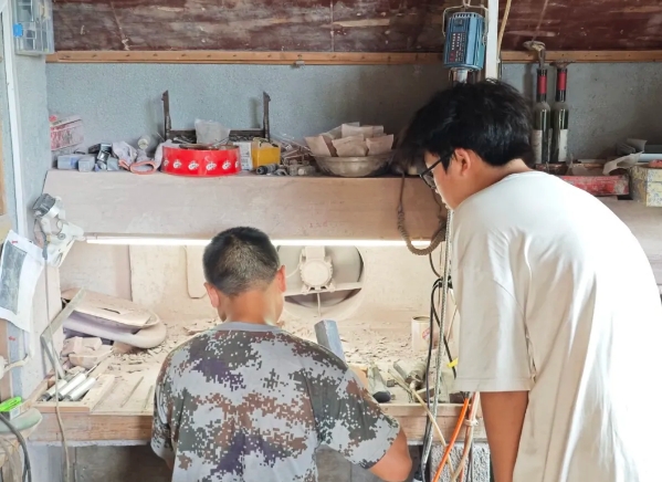 走進(jìn)石雕制作工作室,就看到胡楊老師坐在獨(dú)特的木質(zhì)園柱狀椅子上,倚身兩層的案臺(tái),在擺滿工具和布滿碎灰的木質(zhì)桌面上雕刻著一塊硯臺(tái)。調(diào)研支隊(duì)的大多數(shù)隊(duì)員都是第一次這么近地觀看這類工藝的制作。想到來(lái)前所查資料中胡楊老師光鮮亮麗的形象,當(dāng)時(shí)只覺(jué)得這就是中國(guó)的匠人,不論走到多高的地方,在不為人知的地方總是沉默地做著自己的手藝,不忘初心,有始有終。老師說(shuō):“機(jī)械化生產(chǎn)和純手工生產(chǎn)到底是有區(qū)別的,人懂得避開硬處,雕得更加圓潤(rùn);人更懂得雙方的意思,微妙處總是更加會(huì)意;而且我就是在做我喜歡的事情。”27年從學(xué)徒到大師,胡楊老師以石雕謀生,更以石雕為樂(lè);情感既在每件作品之中,更在這份事業(yè)當(dāng)中。