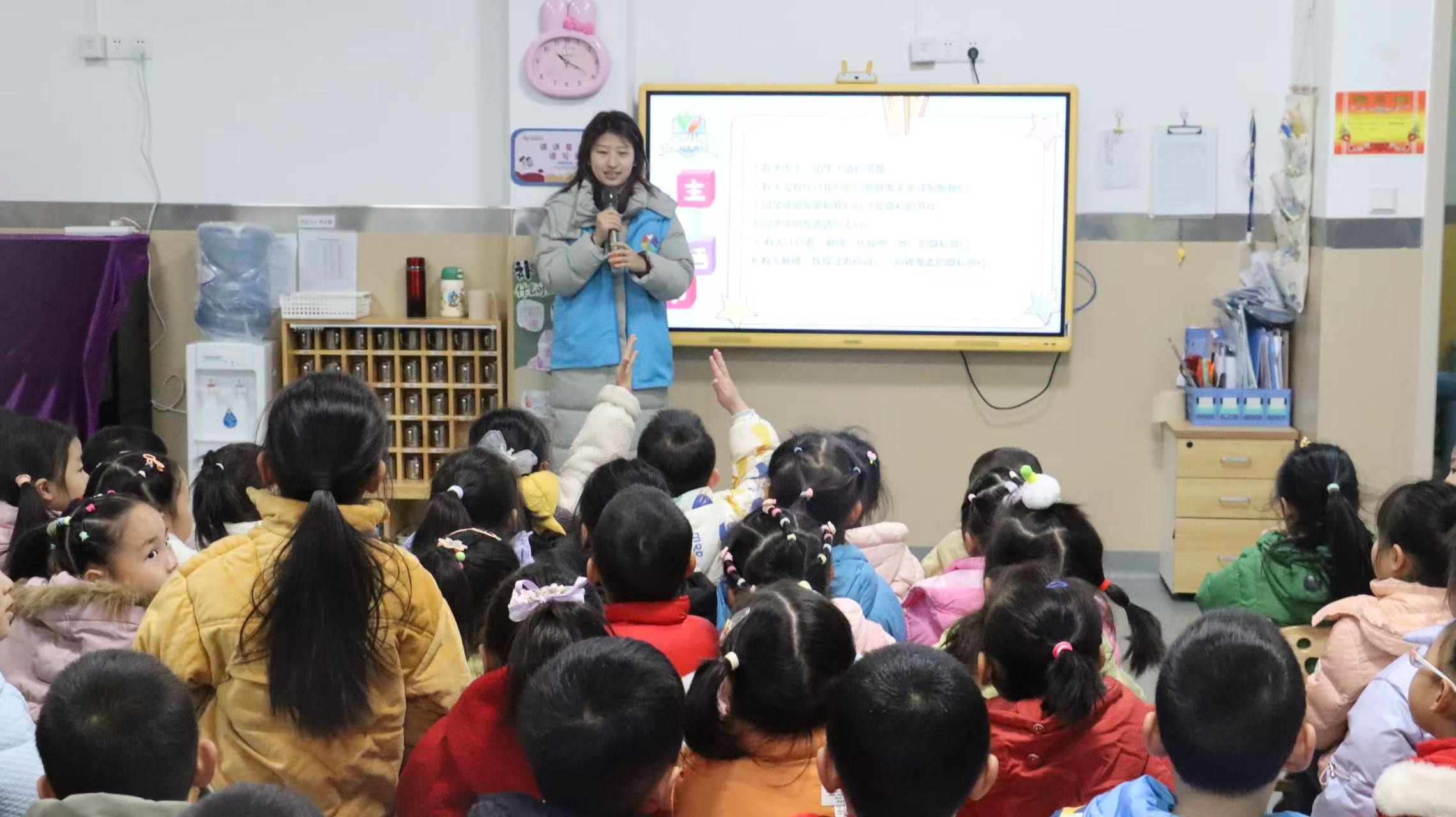 在活動(dòng)中,志愿者通過(guò)ppt講述和觀看動(dòng)畫(huà)片,向小朋友們介紹了如何辨別壞人和保