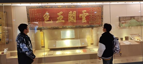 圖為實踐團成員王秋喆、丁坤參觀南通博物苑胡長齡“云開五色”牌匾。 丁坤供圖
