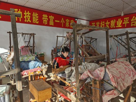 走進制作車間,是一場與匠心的邂逅。選棉,工人師傅們精挑細選,只取纖維細長、色澤潔白之棉,似為藝術(shù)品甄選最純粹的原料。彈棉,弓鳴如雪舞,棉絮蓬松似云,讓生硬的棉花化為輕柔。紡線時,紡錘飛轉(zhuǎn),細線綿延,宛如春蠶吐絲,將縷縷希望纏繞。織布機上,梭子往來如魚,經(jīng)緯交織,噠噠機杼聲奏響勞動樂章,一塊緊實、美觀的粗布漸次成型,每一道工序都滿溢專注執(zhí)著。