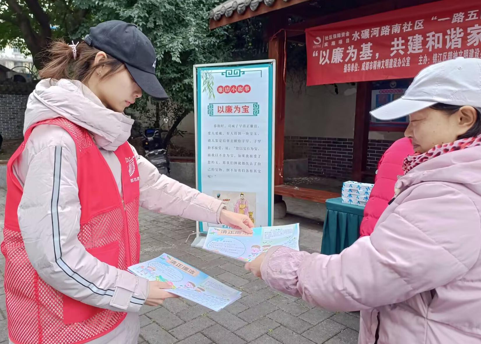 這群身著統一紅色馬甲、頭戴黑色帽子的大學生志愿者,不畏寒冷,熱情洋溢地在社區內穿梭。他們的手中拿著的宣傳頁上印有“以廉為基,共建和諧家園”的標語,以及廉潔文化的相關知識和案例分析。志愿者們耐心地向過往居民講解廉潔文化的重要性,引導大家樹立正確的價值觀。