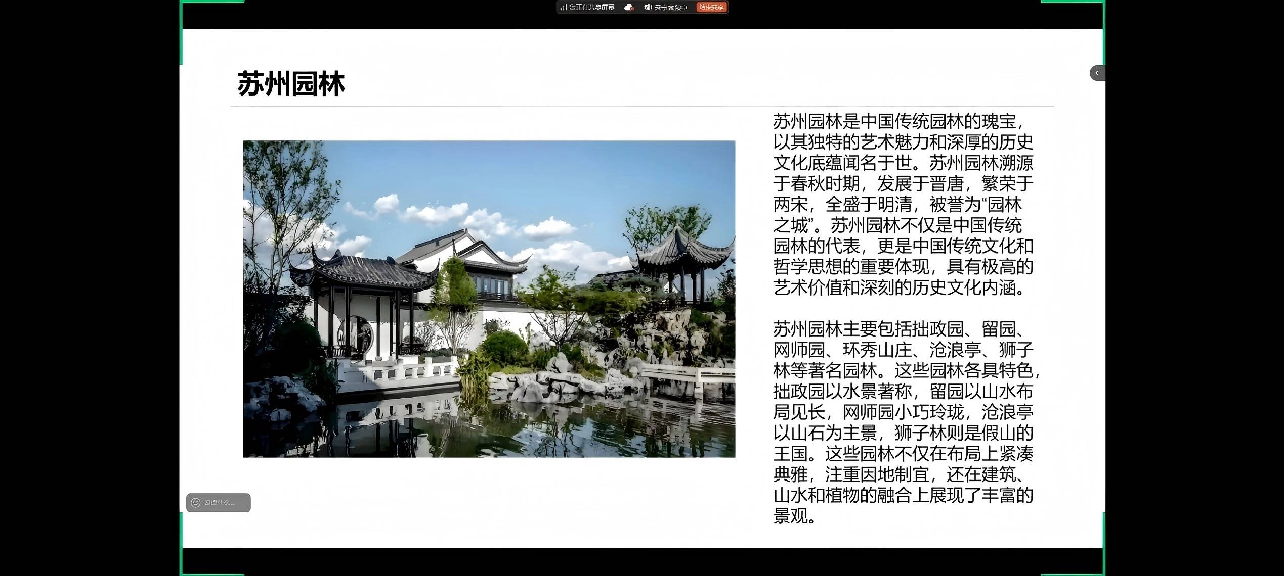 劉銘羽帶來(lái)的 “江蘇風(fēng)土人情” 課程同樣精彩。劉銘羽精心準(zhǔn)備了大量的文字、圖片和視頻資料,用生動(dòng)的語(yǔ)言為孩子們講述江蘇的傳統(tǒng)文化。當(dāng)播放到蘇州園林的視頻時(shí),精致的亭臺(tái)樓閣、蜿蜒的回廊、清澈的湖水,一下子抓住了孩子們的心。劉銘羽詳細(xì)介紹了園林的設(shè)計(jì)理念、建筑特色,讓孩子們感受到了江蘇園林獨(dú)特的藝術(shù)魅力,教室里充滿了歡聲笑語(yǔ)。這堂課加深了孩子們對(duì)江蘇文化的認(rèn)知,培養(yǎng)了他們對(duì)美的追求,更提升了民族自信心和自豪感。