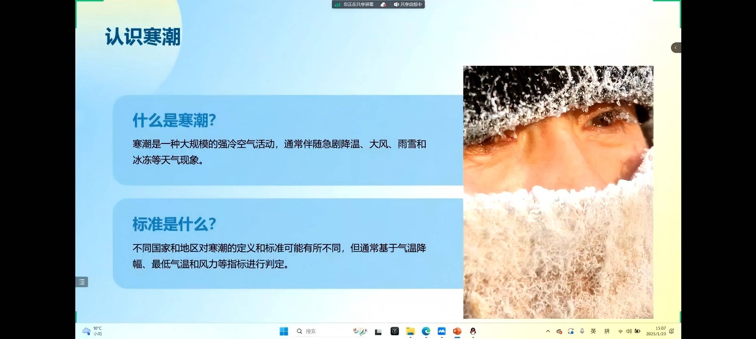 李傲宇的 “冷空氣科普” 課程則充滿了科學(xué)性和實(shí)用性。課程伊始,李傲宇以 “什么是冷空氣?” 這一問(wèn)題拉近了與孩子們的距離。他通過(guò)生動(dòng)形象的圖片和動(dòng)畫,為孩子們揭示了寒潮與冷空氣形成的奧秘和分類。接著,他又詳細(xì)介紹了冷空氣對(duì)日常生活和生產(chǎn)活動(dòng)的影響,以及如何應(yīng)對(duì)冷空氣帶來(lái)的危害。他教孩子們?nèi)绾胃鶕?jù)天氣預(yù)報(bào)添加衣物,如何在寒潮天氣中保護(hù)好自己的身體。這堂課讓孩子們獲得了寶貴的知識(shí),增強(qiáng)了他們應(yīng)對(duì)自然變化的能力。